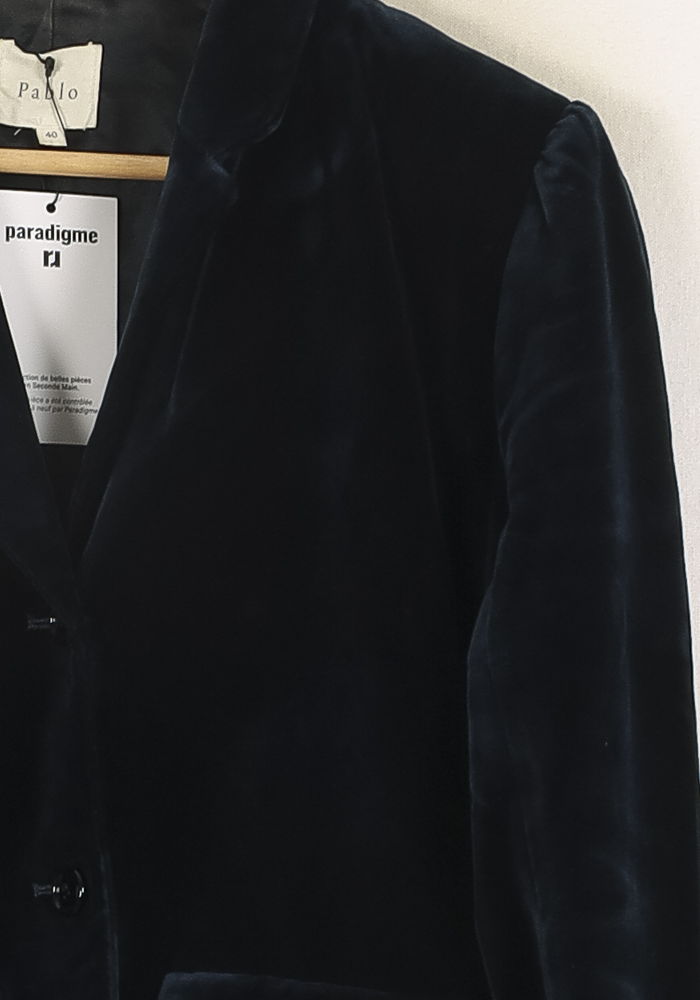 Gilet et velours bleu Pablo, taille L/40, élégance et charme contemporains. La finition du velours est réalisée avec raffinement, les détails sont parfaits, le résultat est un revers élégant et la touche finale parfaite à l'ensemble. Apportez une touche sublime à votre tenue de bureau ou associez-la à une tenue chic et élégante pour vos soirées.