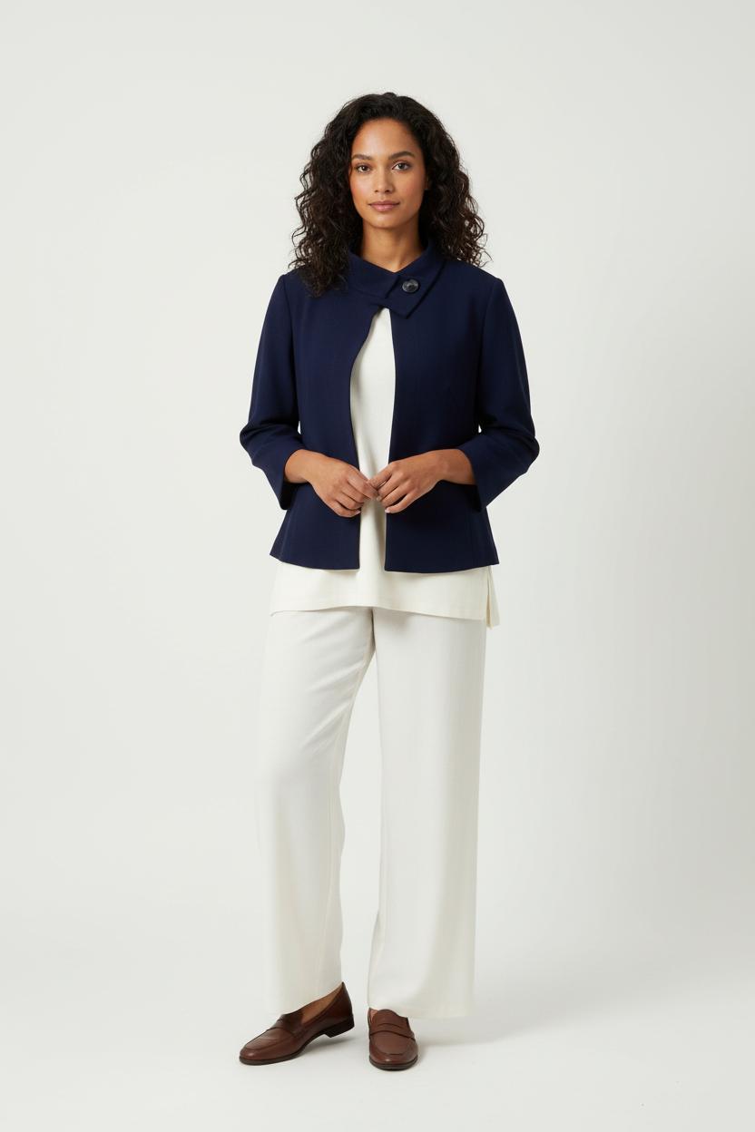 Veste courte bleu marine Caroll taille M/38, élégante avec une forme asymétrique et arrondie, idéale pour une allure soignée et en toutes circonstances. Tissu composite composé principalement de polyester, de viscose et d'élasthanne, avec une coupe structurée et un doublage 100% polyester pour assurer confort et bien-être général, avec une touche moderne et minimaliste. Parfait pour accompagner vos tenues professionnelles ou parfaire votre look chic lors d'un dîner en soirée.