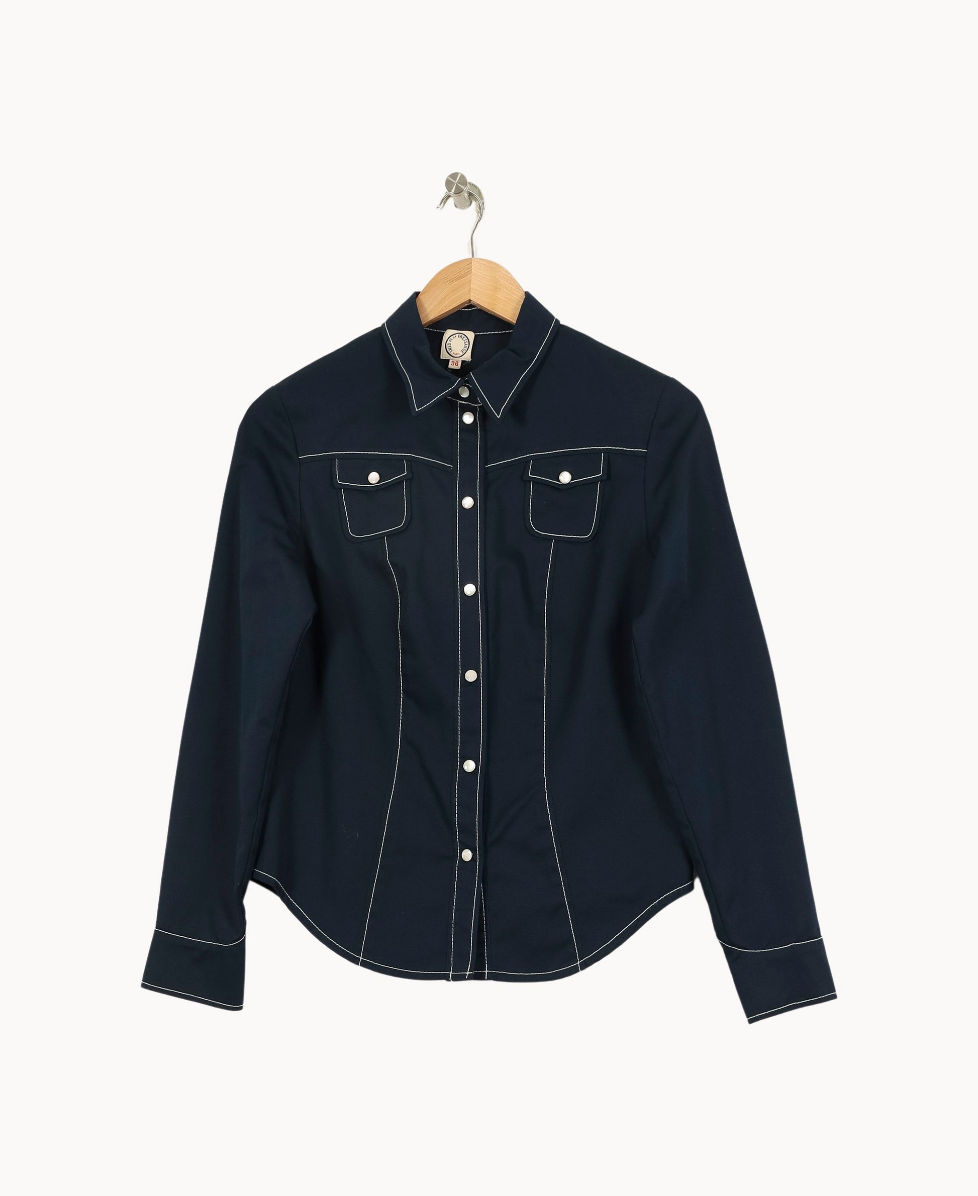 Veste bleu femme Ines de la Fressange Paris, taille S/36, dotée de poches poitrine à rabat et de boutons contrastés. Confectionnée dans une matière souple au fini légèrement satiné, elle se distingue par ses surpiqûres blanches apparentes qui soulignent les lignes du vêtement et lui apportent une touche résolument moderne. Idéale pour une journée de travail au bureau ou pour une sortie élégante en ville.