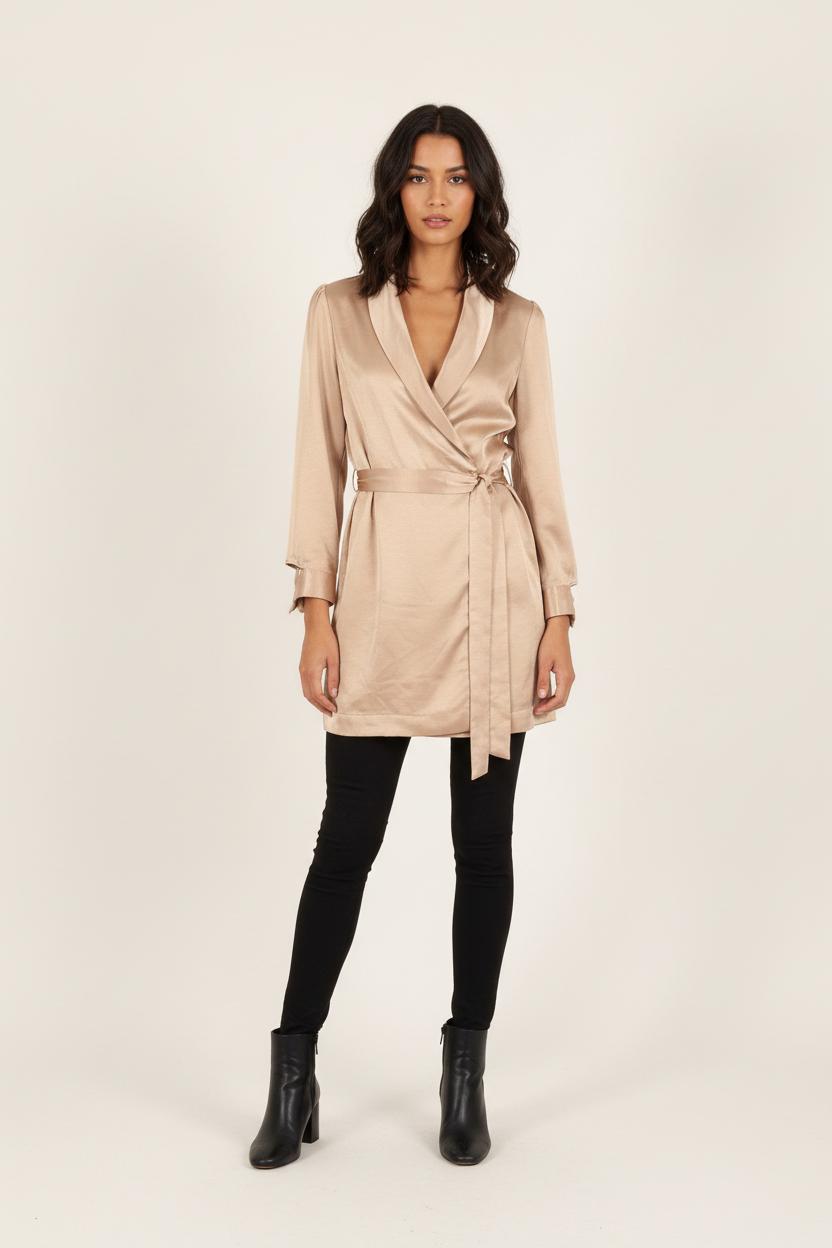 Cardigan portefeuille beige Barje, taille S/36, coupe élégante et raffinée. La robe Confectionery est confectionnée dans une matière satinée et fluide, qui se distingue par la longueur de ses manches longues et ses boutonnières brossées, lui conférant une allure raffinée. Pour soigner votre tenue, que ce soit pour une occasion spéciale ou un événement professionnel, il vous faut ajouter une touche chic.