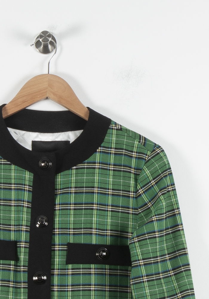 Gilet à carreaux verts Maje, taille M/38, une pièce élégante et moderne de la catégorie gilets. Fabriqué à partir d'une composition de tissu principale composée de 65 % de polyester, 32 % de viscose et 3 % d'élasthanne, utilisant le motif distinctif des carreaux, les détails des contrastes noirs sur le col, le devant et les accents, et les détails des décorations sur les poches. Idéal pour une nouvelle tenue de bureau ou une tenue de ville, ajoutant une touche de sophistication à l'ensemble.