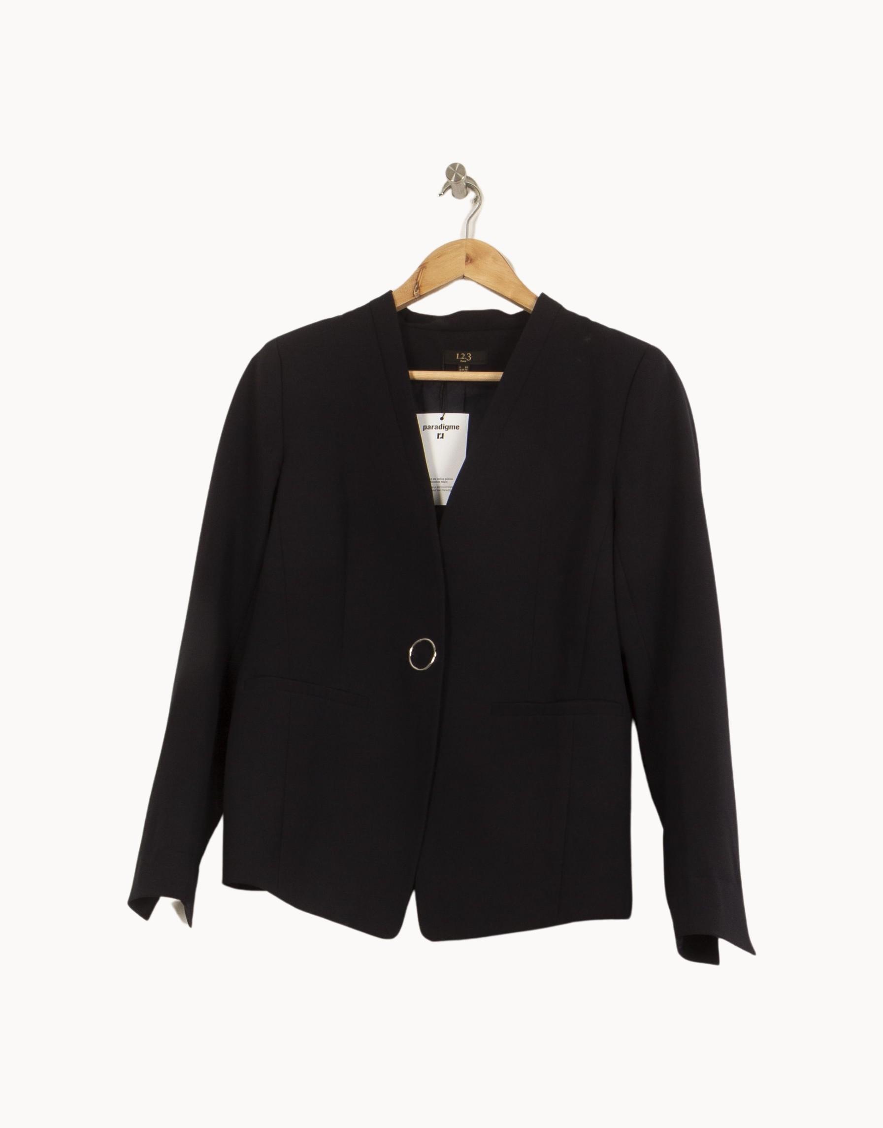 Veste bleu foncé Maison 123, taille M/38, à la coupe et à la structure élégantes. Le processus de production est réalisé de manière soignée et ordonnée, tandis que la préparation d'une pièce de métal est effectuée avec discrétion et précision, avec une touche de raffinement et d'originalité. Idéal pour sublimer une tenue de bureau ou accompagner une soirée habillée.