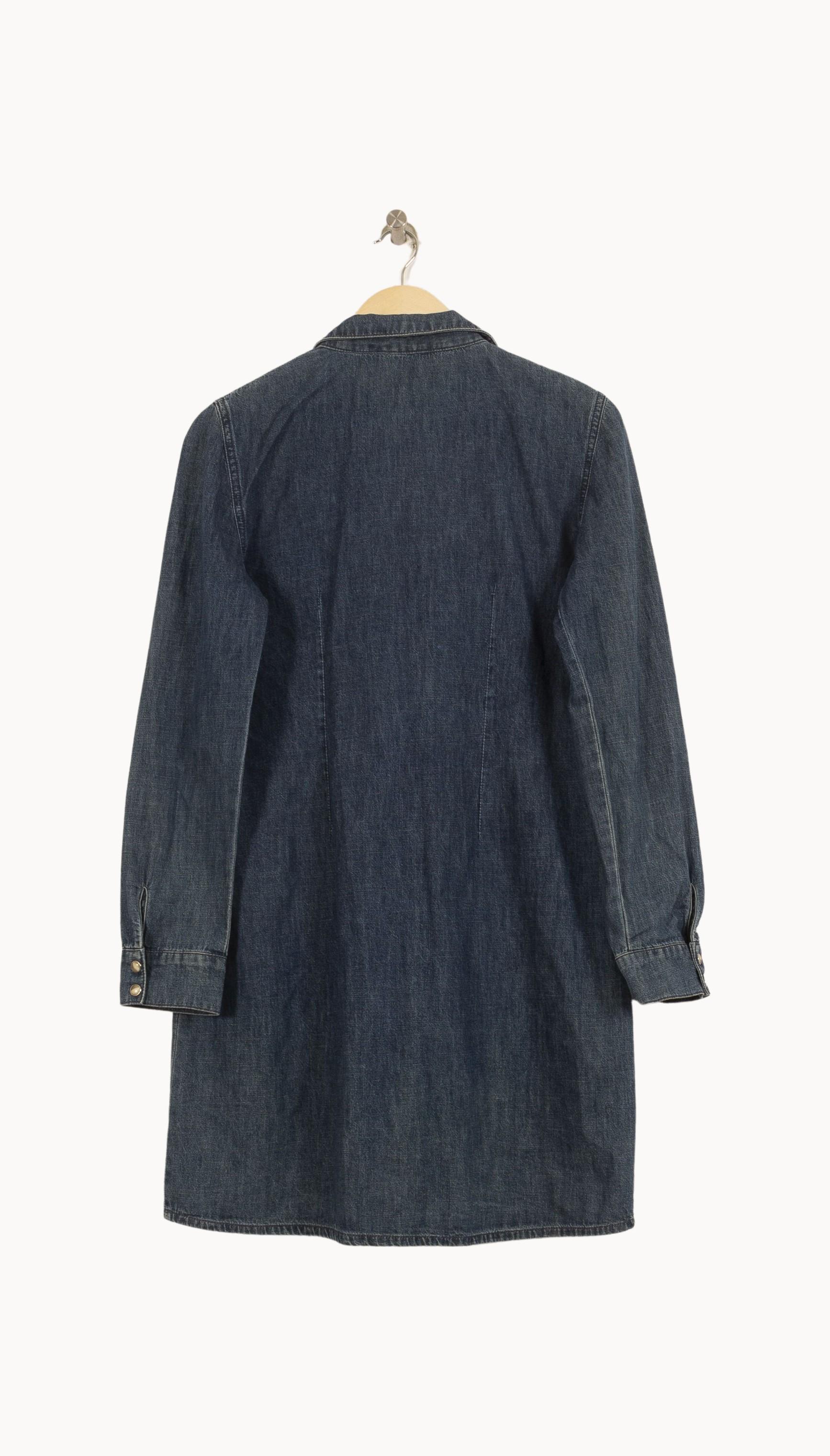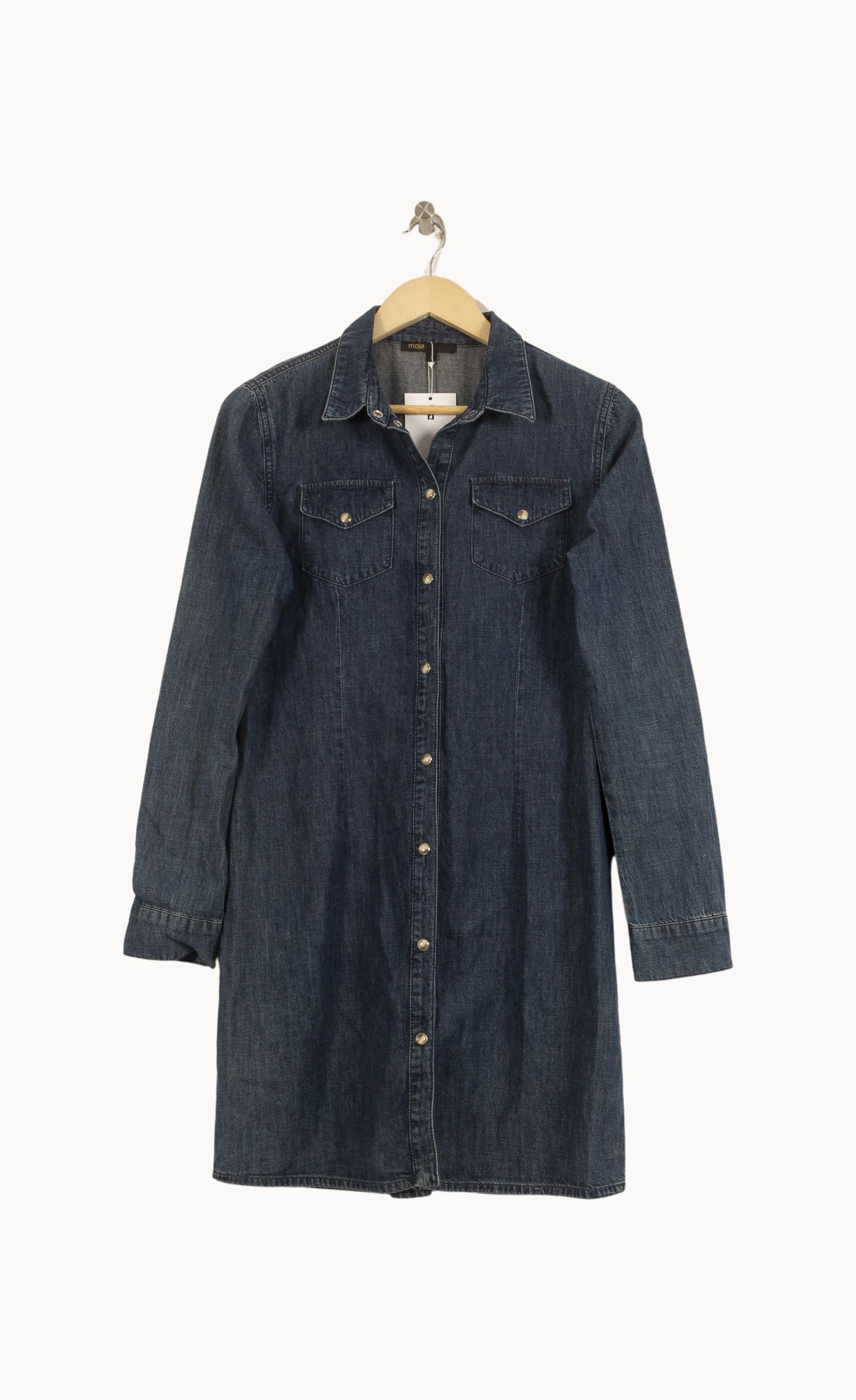 Veste longue en jean bleu Maje, taille L/40, arborant une coupe classe et les boutonnées à lacets sur la poitrine. Une confiserie d'un bleu denim intense, caractérisée par un effet liqueur métallique et des contrastes saisissants, pour un charme contemporain à la fois décontracté et chic. Idéal pour un contrat de tri entre une promenade et un long voyage.