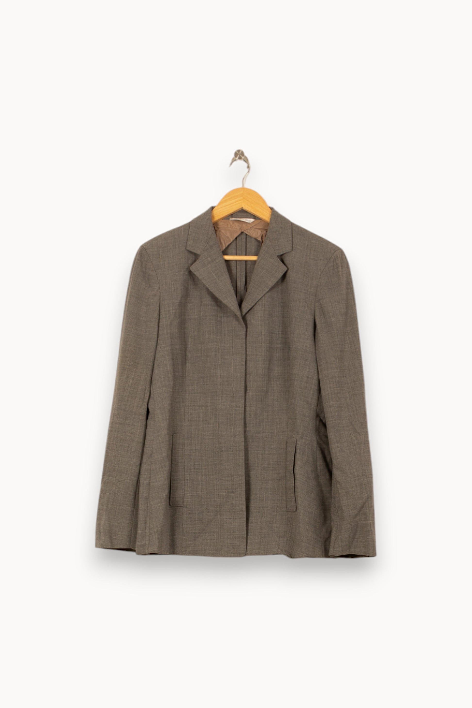 Veste Max Mara grise, taille L/40, à la coupe droite élégante, idéale pour un style professionnel ou city chic. Confectionnée dans une matière à l'aspect légèrement texturé, elle présente un col tailleur classique et deux poches à rabat, offrant une allure raffinée et intemporelle. Parfaite pour une réunion d'affaires ou un événement formel.