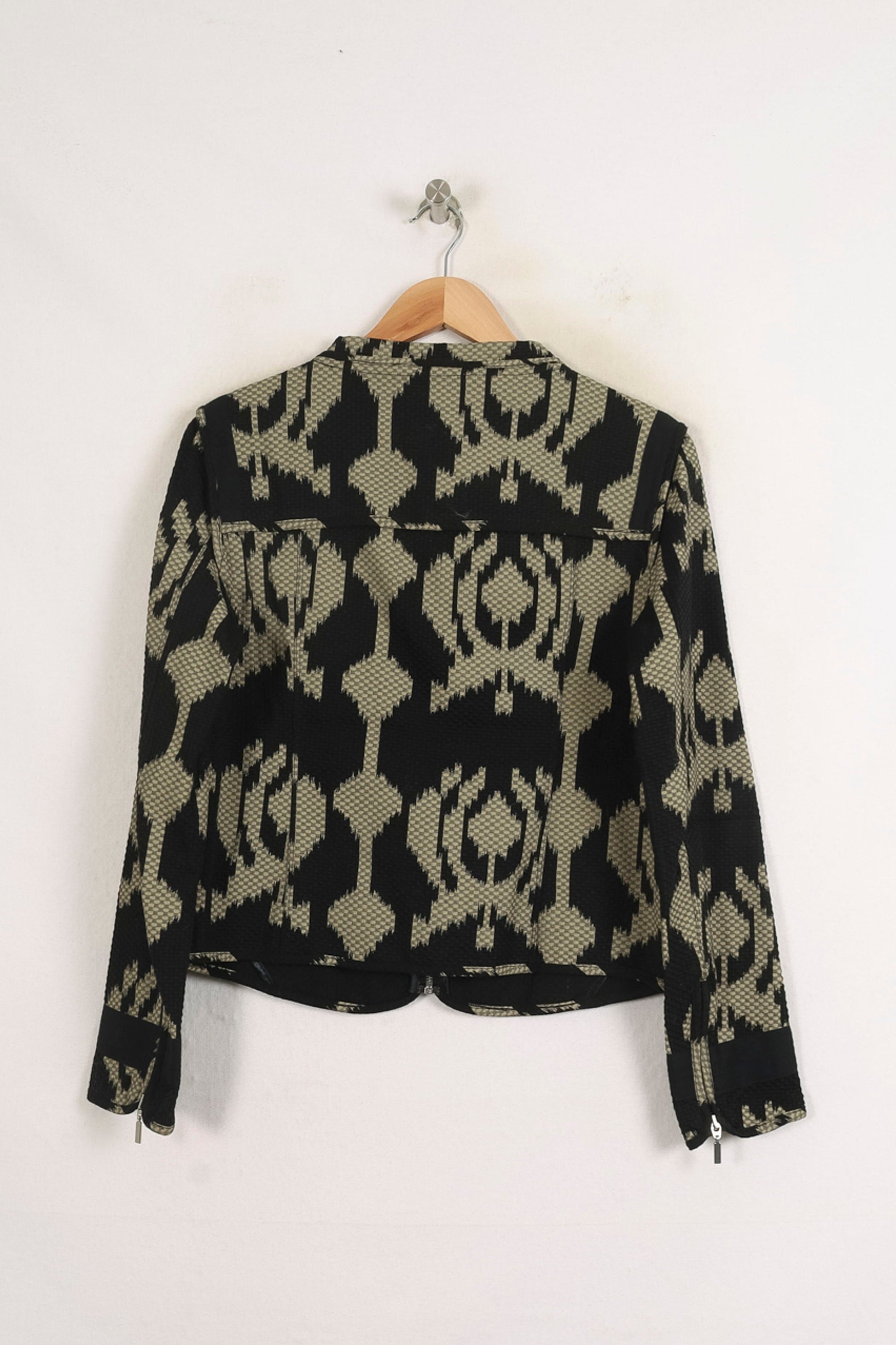 Veste noire jacquard imprimé La Fée Maraboutée, taille L/40, au design sophistiqué et élégant. La confiserie est une structure matérielle dotée d'un motif graphique unique, qui se distingue par sa coupe, les détails de ses poches et sa fermeture éclair finie, une touche de modernité et de raffinement appropriée. Idéal pour une réunion professionnelle ou un dîner élégant, avec toutes les finitions sublimes.