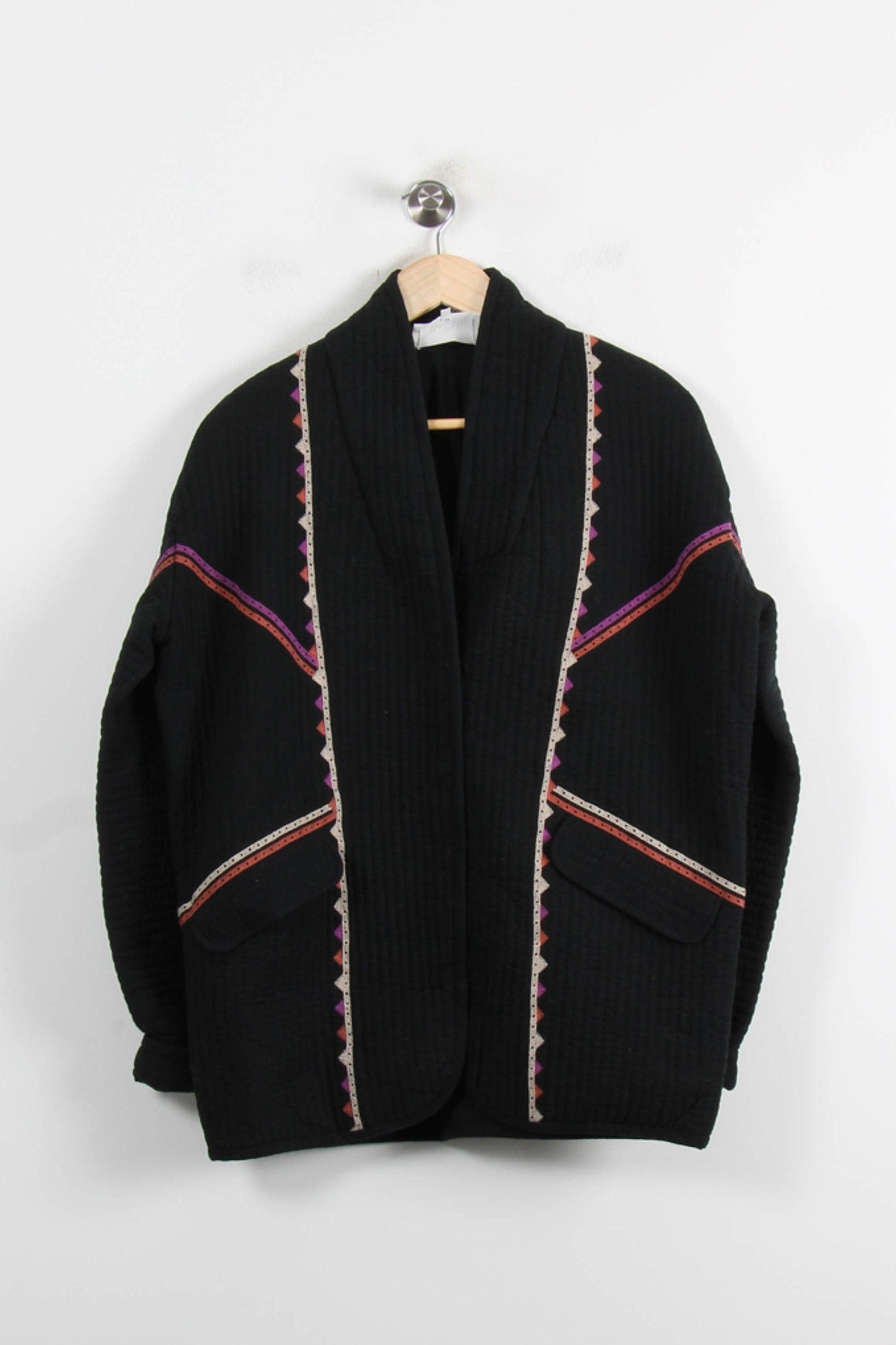 Gilet ba&sh bleu taille M/38, avec des dimensions amples et des détails de couleurs contrastées du devant et des manches. La production d'un matériau selon l'aspect du matelassé, la distinction entre les motifs, les schémas géométriques des couleurs et les deux grands motifs selon le dessin, révèlent ainsi un caractère et une tendance uniques. Idéal pour une approche de tri et pour retrouver une touche d'originalité dans le cadre d'une relation contractuelle en journée.