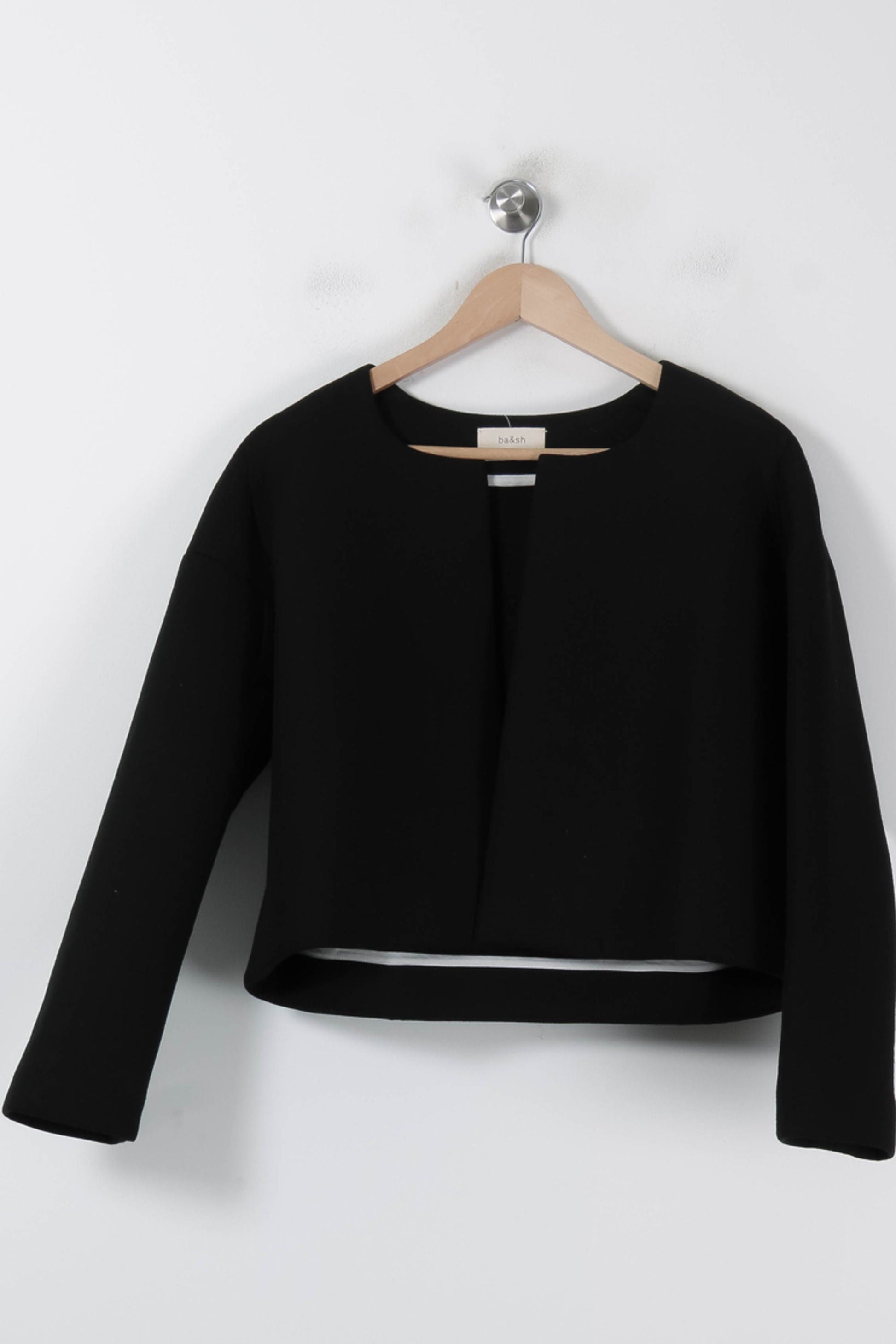 Veste courte noire ba&sh, taille S/36, à la coupe et finition, idéale pour une allure chic et minimaliste. Tissu composite composé à 50 % de viscose et à 50 % de polyester, qui se distingue par la modernité de sa construction et de sa structure, avec une double couche confortable en polyester et élasthanne. Créez un accessoire pour une tenue de bureau ou sublimez votre look lors d'un événement formel.
