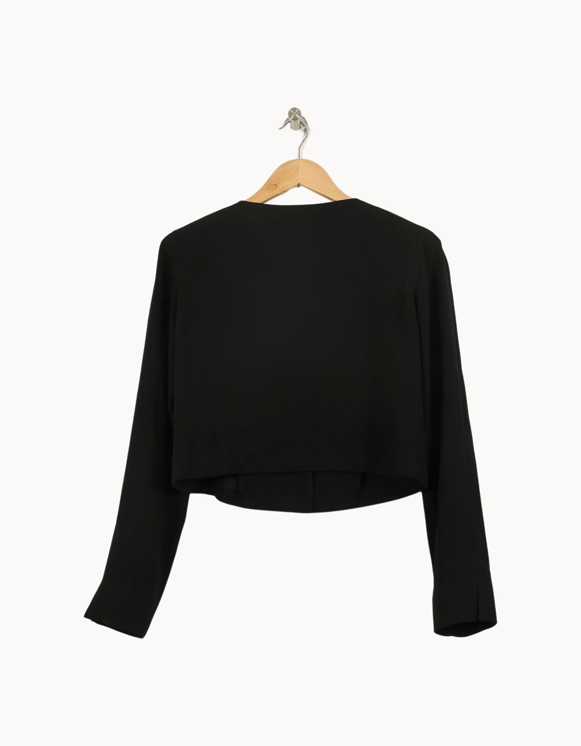 Veste noire élégante Agnès b., taille XL/42, à la coupe courte et épurée, idéale pour apporter une touche sophistiquée à votre vestiaire. Cette pièce se distingue par sa matière lisse et son boutonnage discret ton sur ton, soulignant un design minimaliste tout en finesse propre à la marque. Parfaite pour un rendez-vous professionnel, elle s’accorde également avec une tenue décontractée-chic lors d’une sortie en ville.
