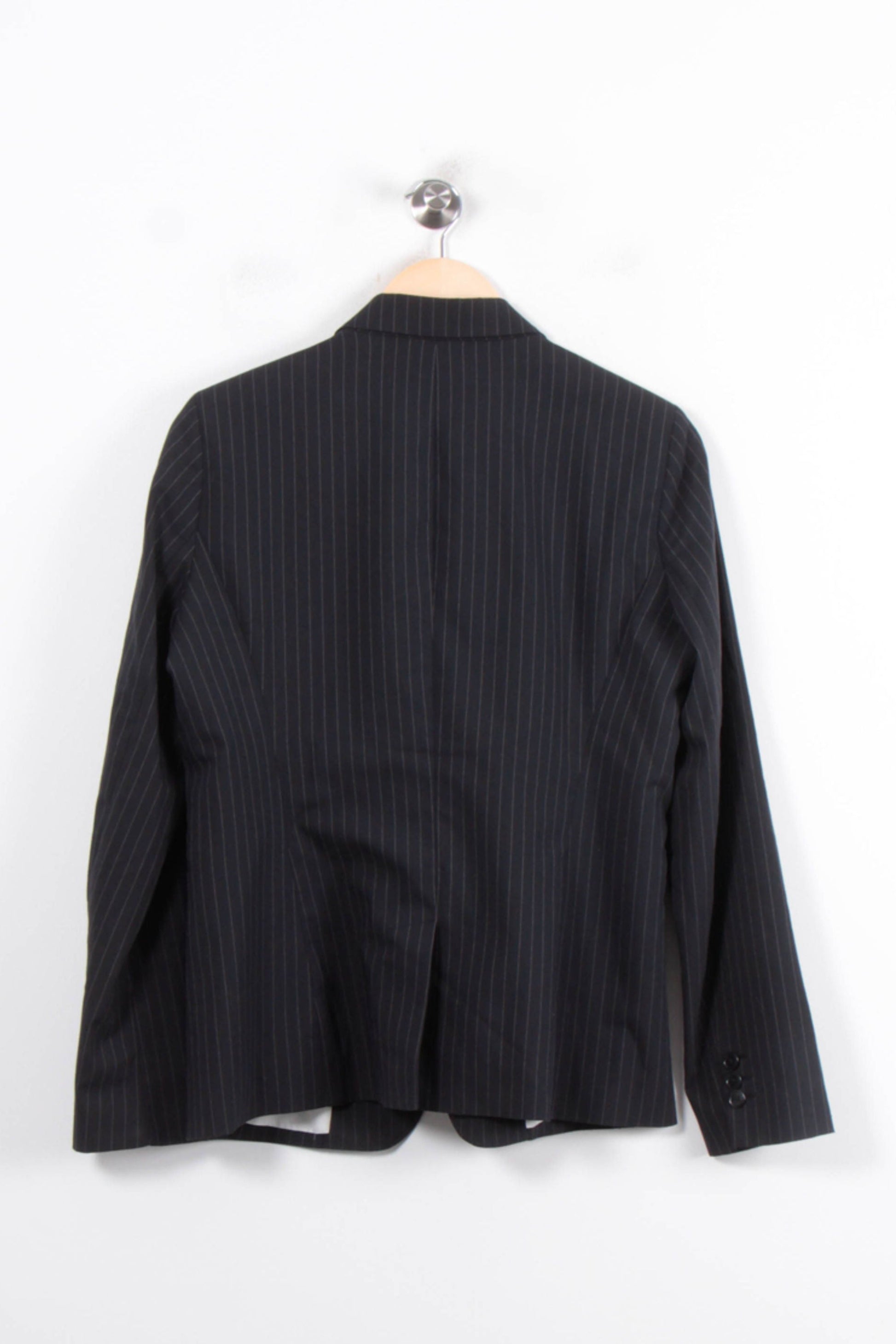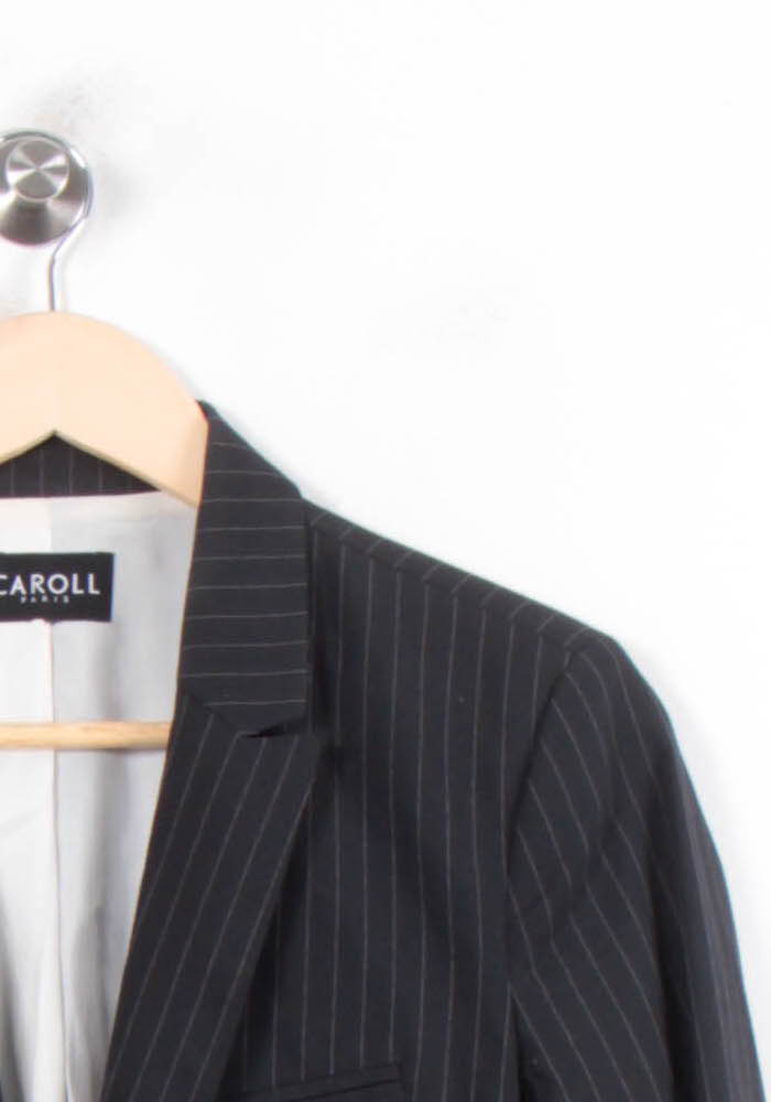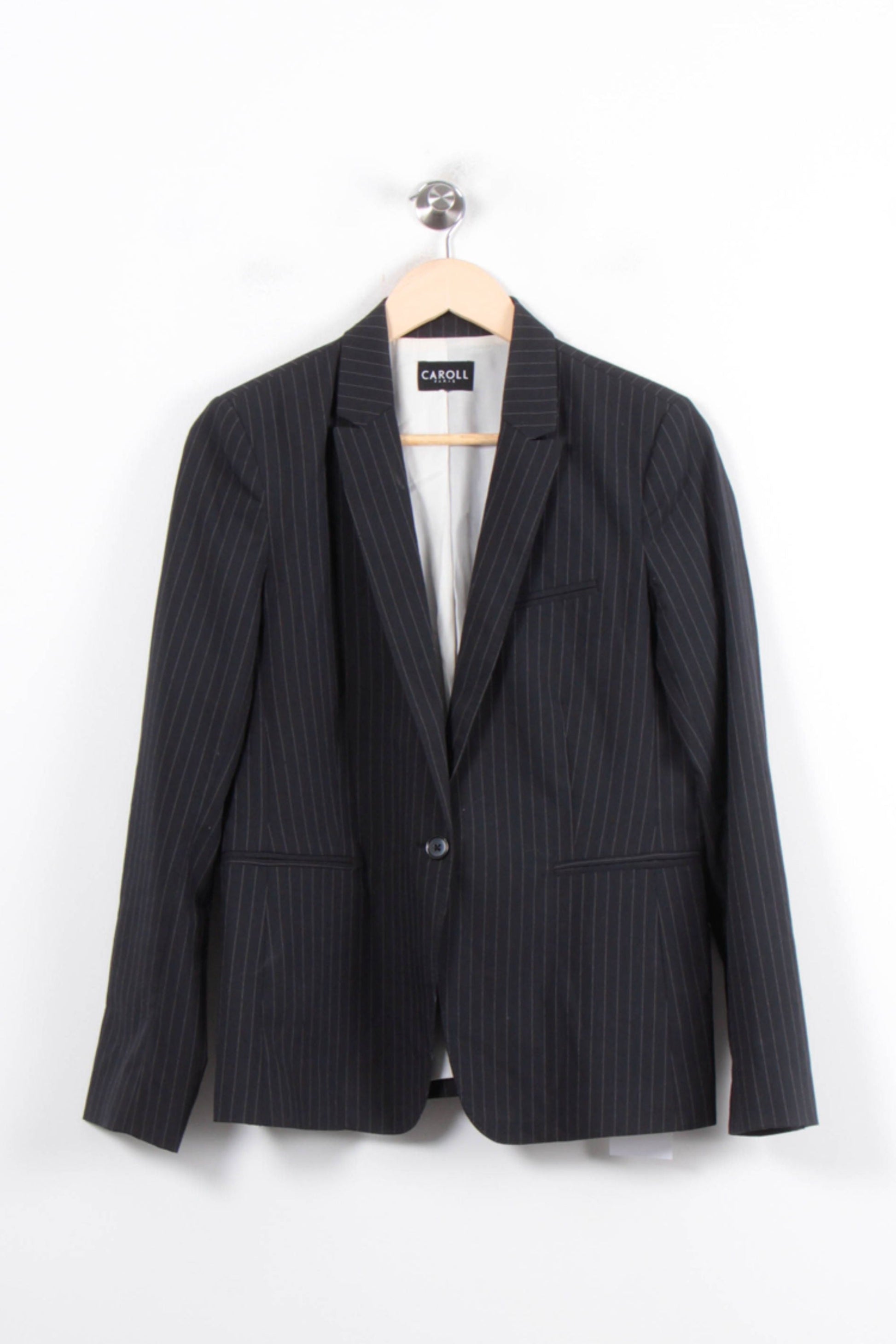 Veste tailleur noire à fines rayures, marque Caroll, taille XL/42. Confectionnée dans un tissu à rayures discrètes, cette veste se distingue par sa coupe structurée, ses poches passepoilées et son boutonnage classique, lui conférant une élégance intemporelle. Idéale pour une réunion professionnelle ou un rendez-vous formel, elle s’associe parfaitement à un pantalon ou une jupe pour un look sophistiqué.