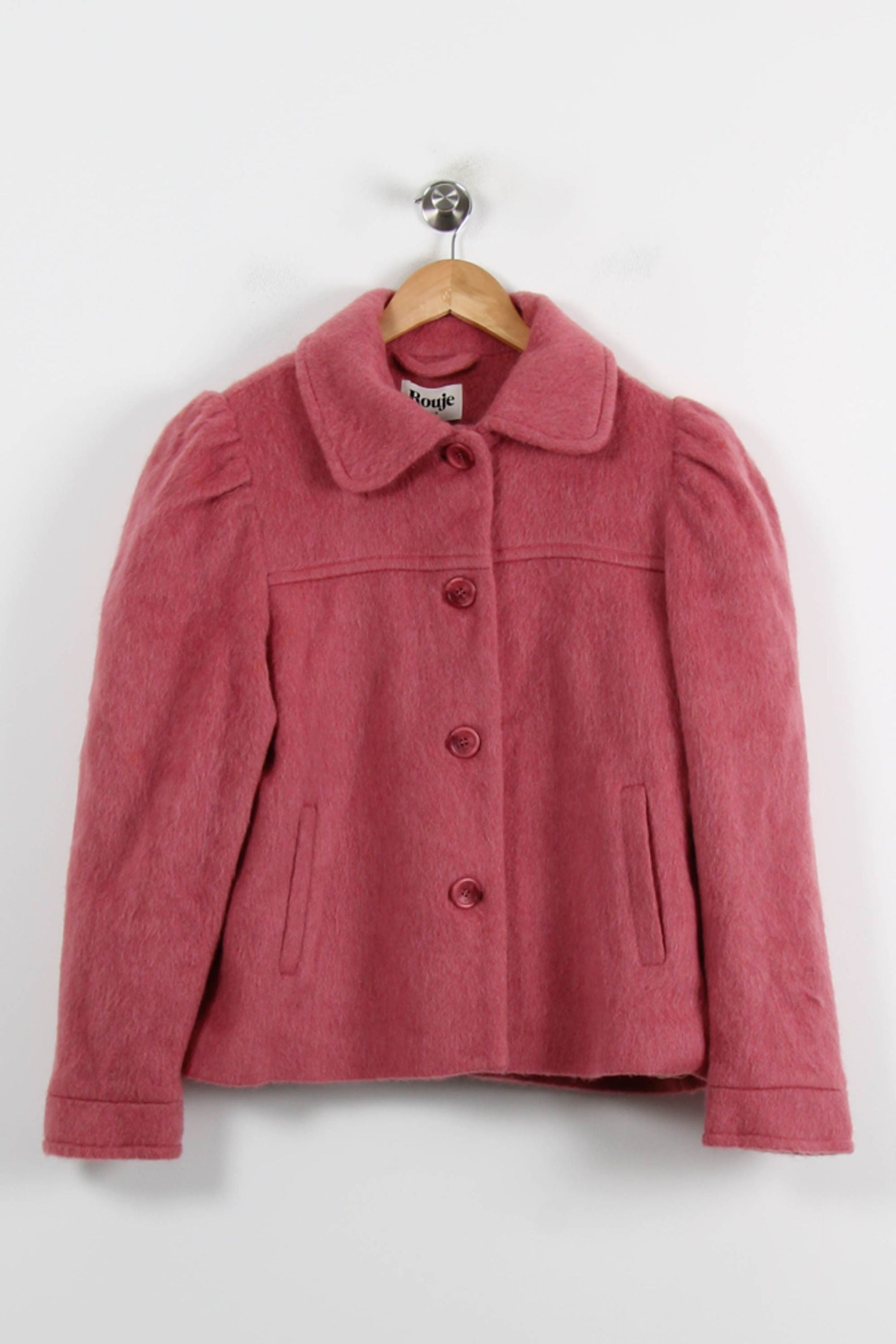Manteau rose Rouje, taille M/38 : élégant manteau à la coupe structurée, orné d’un col classique et de boutons assortis, signé Rouje. Confectionné dans une matière douce au toucher et légèrement duveteuse, ce vêtement se distingue par ses épaules subtilement froncées et ses poches discrètes, apportant raffinement et originalité. Parfait pour une promenade automnale chic en ville ou une sortie entre amis lors des journées fraîches.