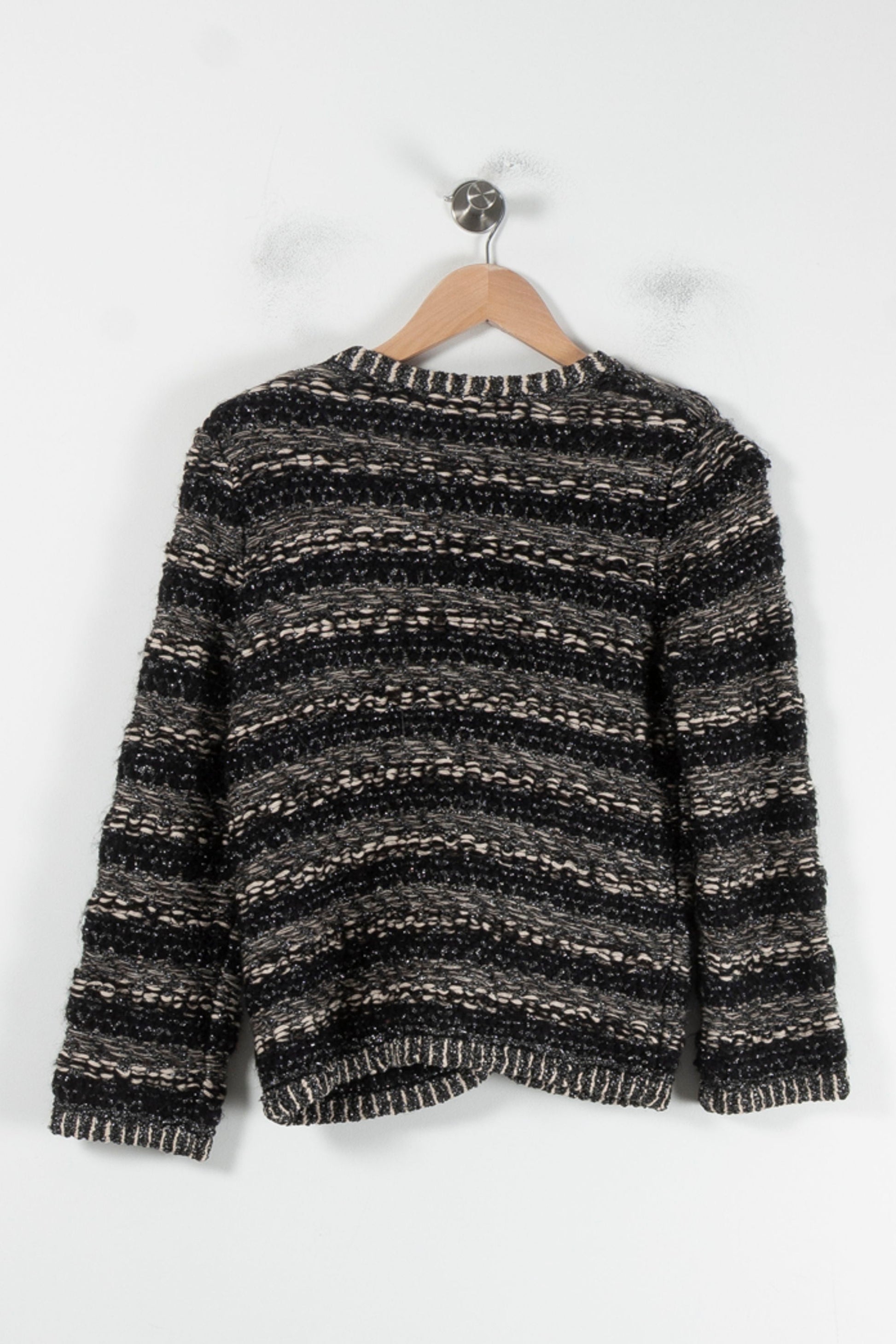 Gilet noir texturé en maille, Maje, taille S/36. Confectionné à partir d'un mélange de polyester, acrylique, coton, polyamide, fibres métalliques, alpaga et mohair, ce vêtement présente un aspect visuellement élégant et un look original, grâce au relief et aux finitions soignées, lui conférant un caractère raffiné. Idéal pour sublimer votre tenue de bureau ou parfaire votre look chic lors d'un dîner.