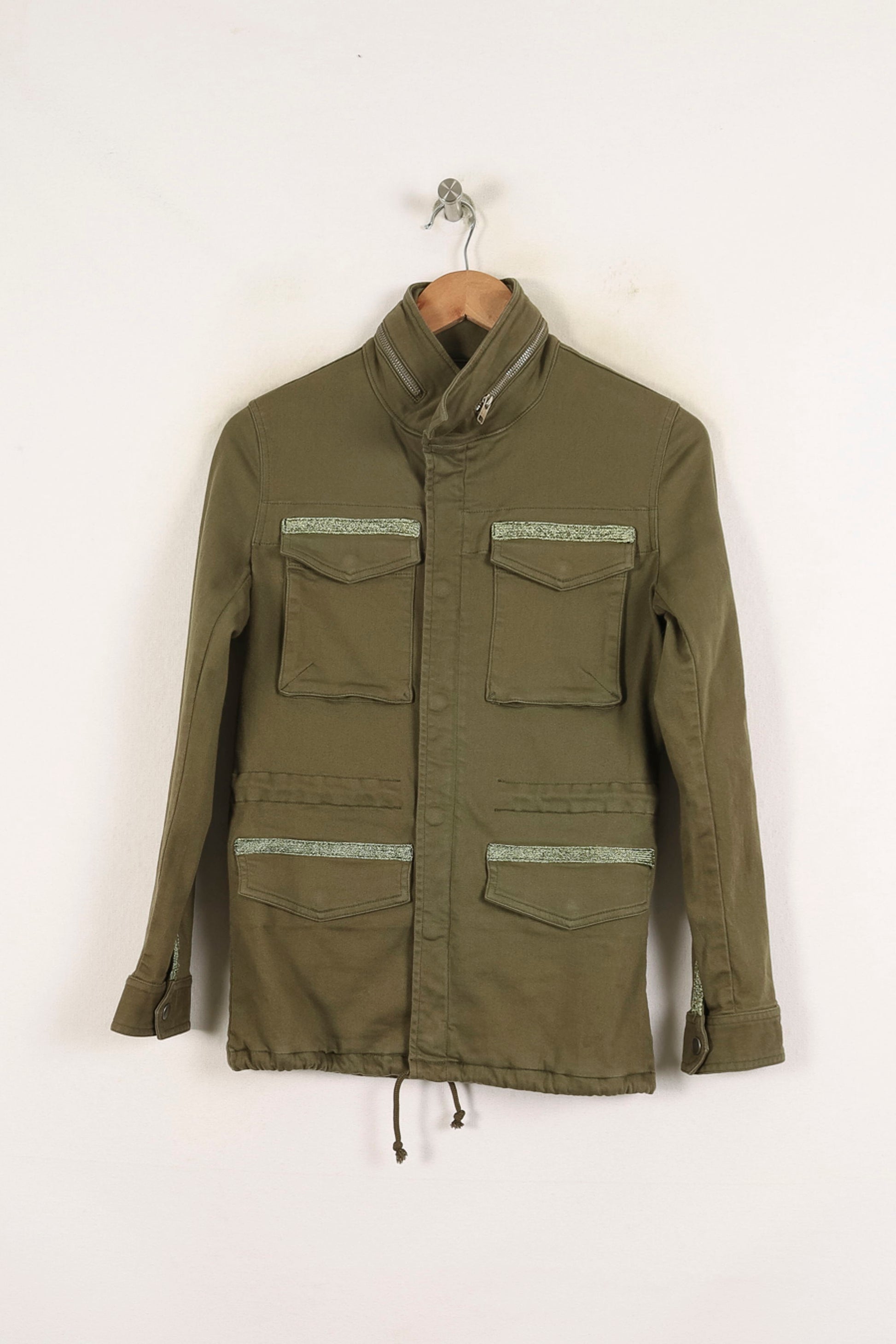 Veste verte Bérénice taille S/36, dotée de placques plaquées ornées de détails paillettes sur le devant. La confiserie est confectionnée à partir d'un matériau à structure tombante, qui se distingue par la combinaison de la fermeture éclair et des contrastes finaux, avec une touche d'originalité et de modernité. Idéal pour une compositrice qui souhaite un look décontracté chic en soirée ou pour dynamiser une tenue de week-end.