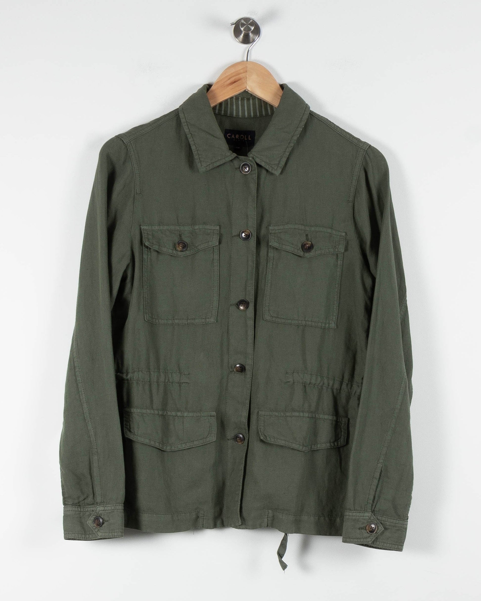 Veste femme verte Caroll, taille M/38, avec une coupe et une finition soignées pour un style et une pratique modernes. Il est important de noter que la qualité du matériau est souple et confortable, associée à une boutonnière de ferme et à un cordon de jardin à la taille, signifiant le détail élégant. Complétez votre tenue pour votre contrat pendant le shooting photo du week-end.
